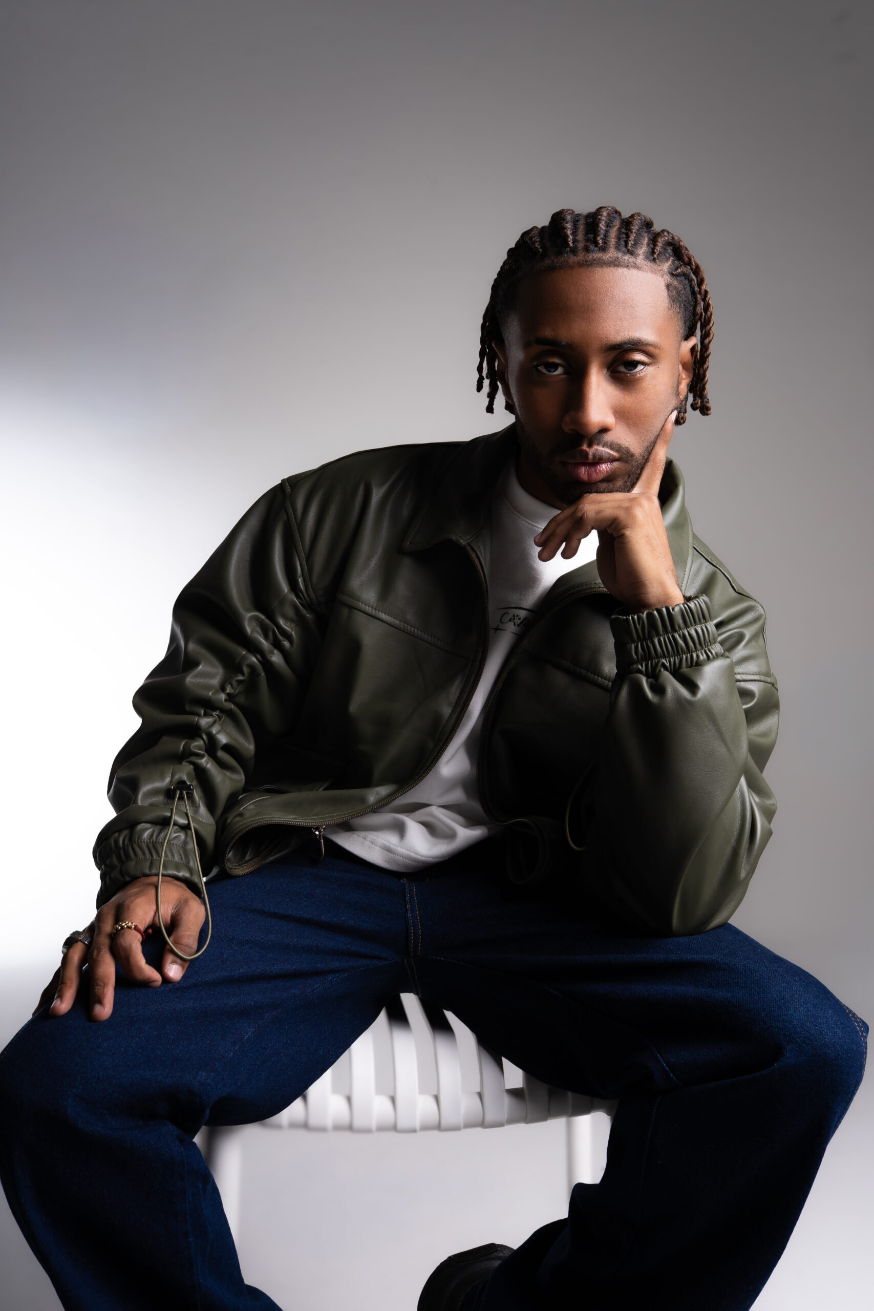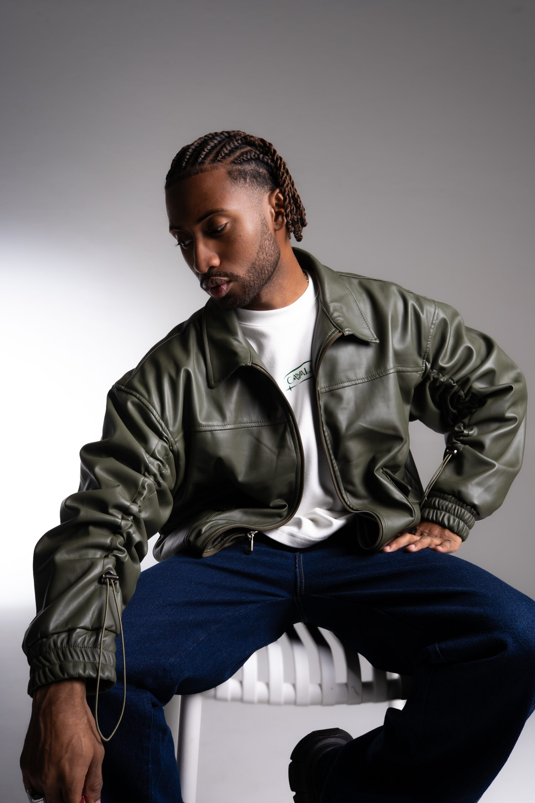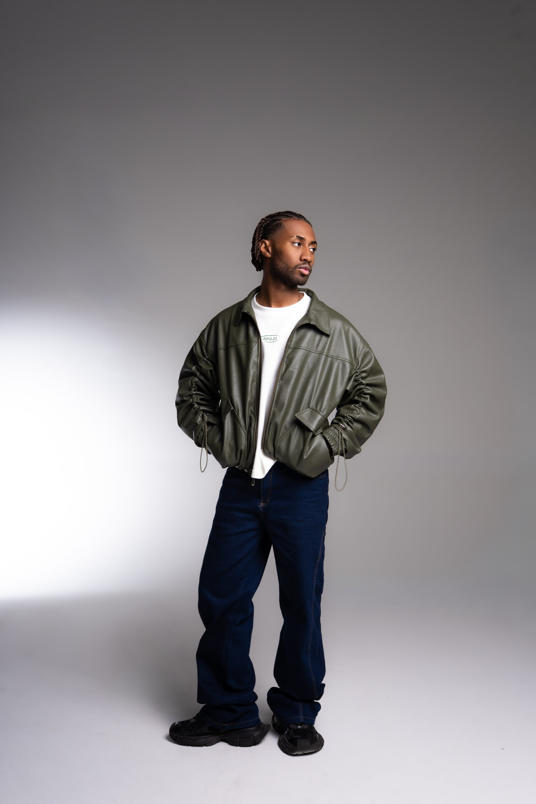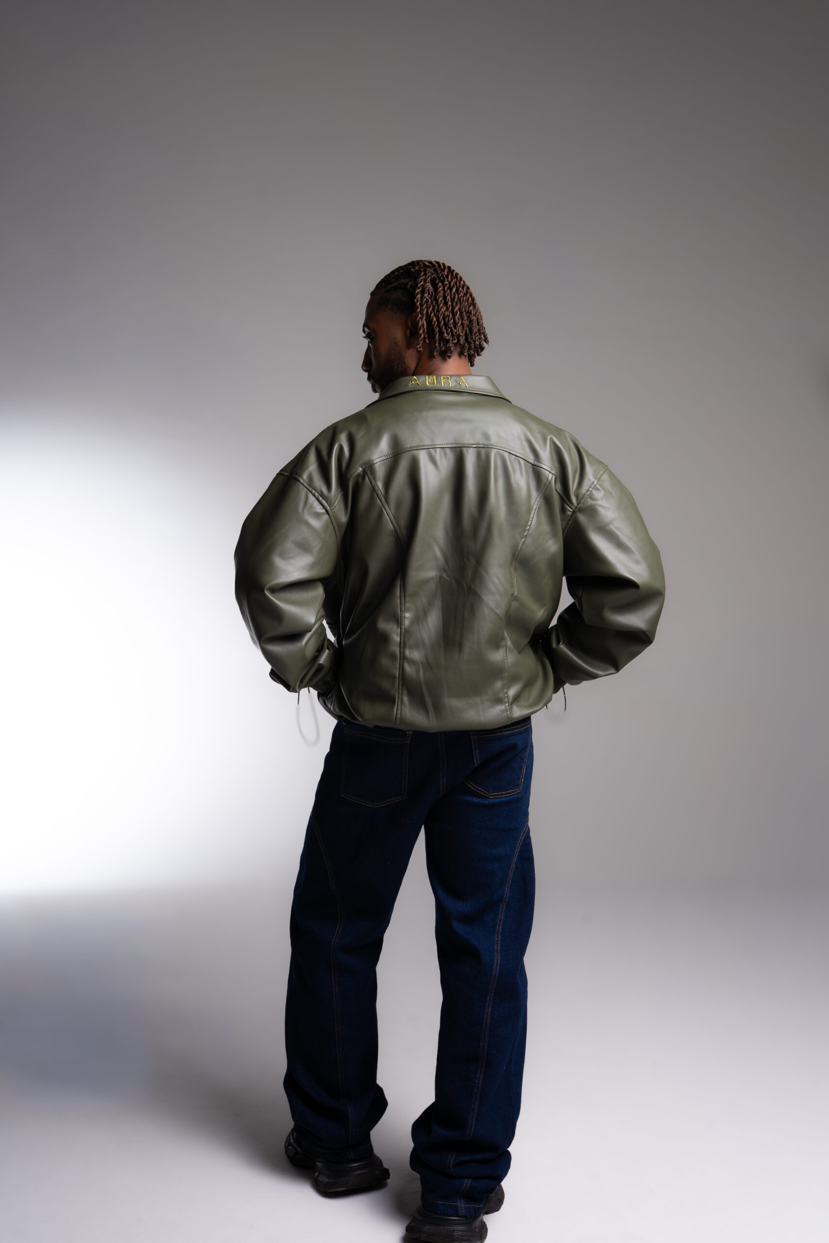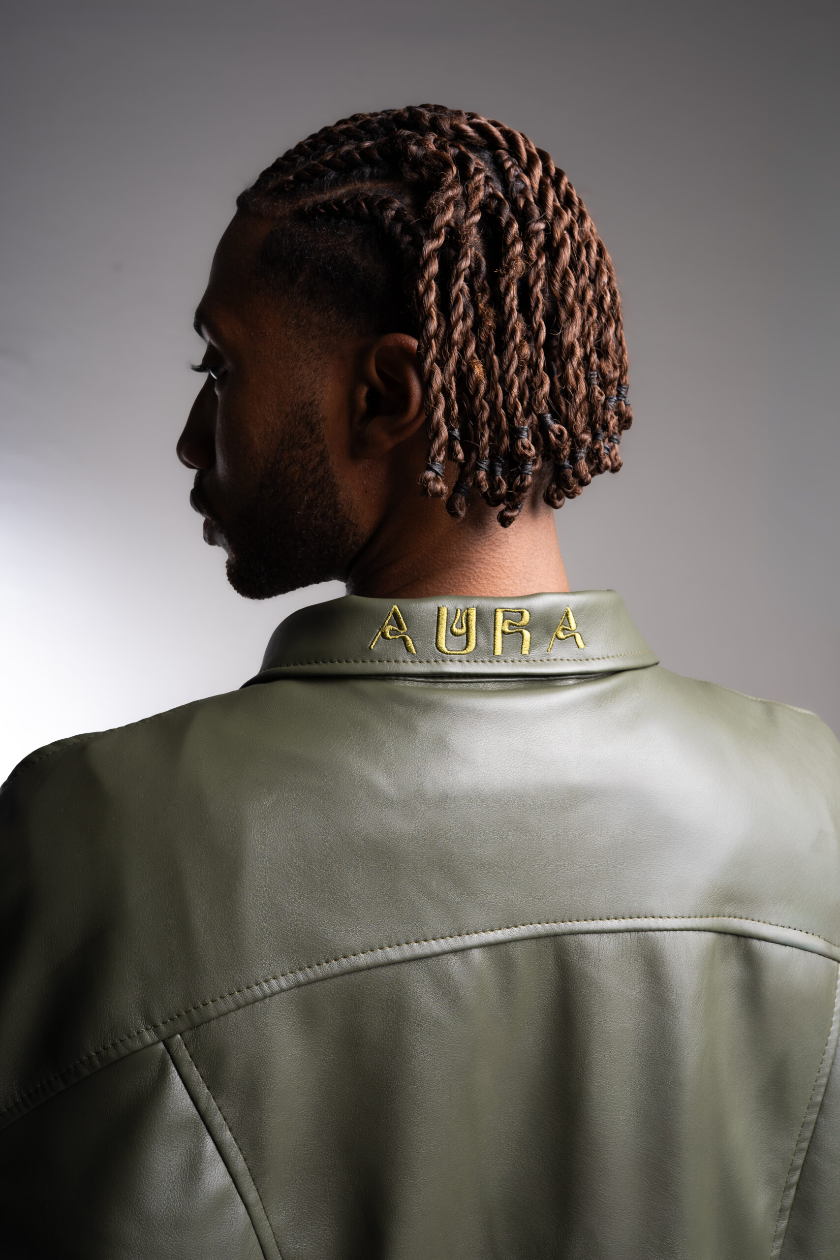 Chaqueta tipo bomber jacket en cuerina, con resorte ajustable en las mangas, cuello bordado tono a tono con la palabra Aura, forrada en brioni con bolsillo interno, 4 bolsillos en el delantero, dos con tapa, resorte en puños y dobladillo.