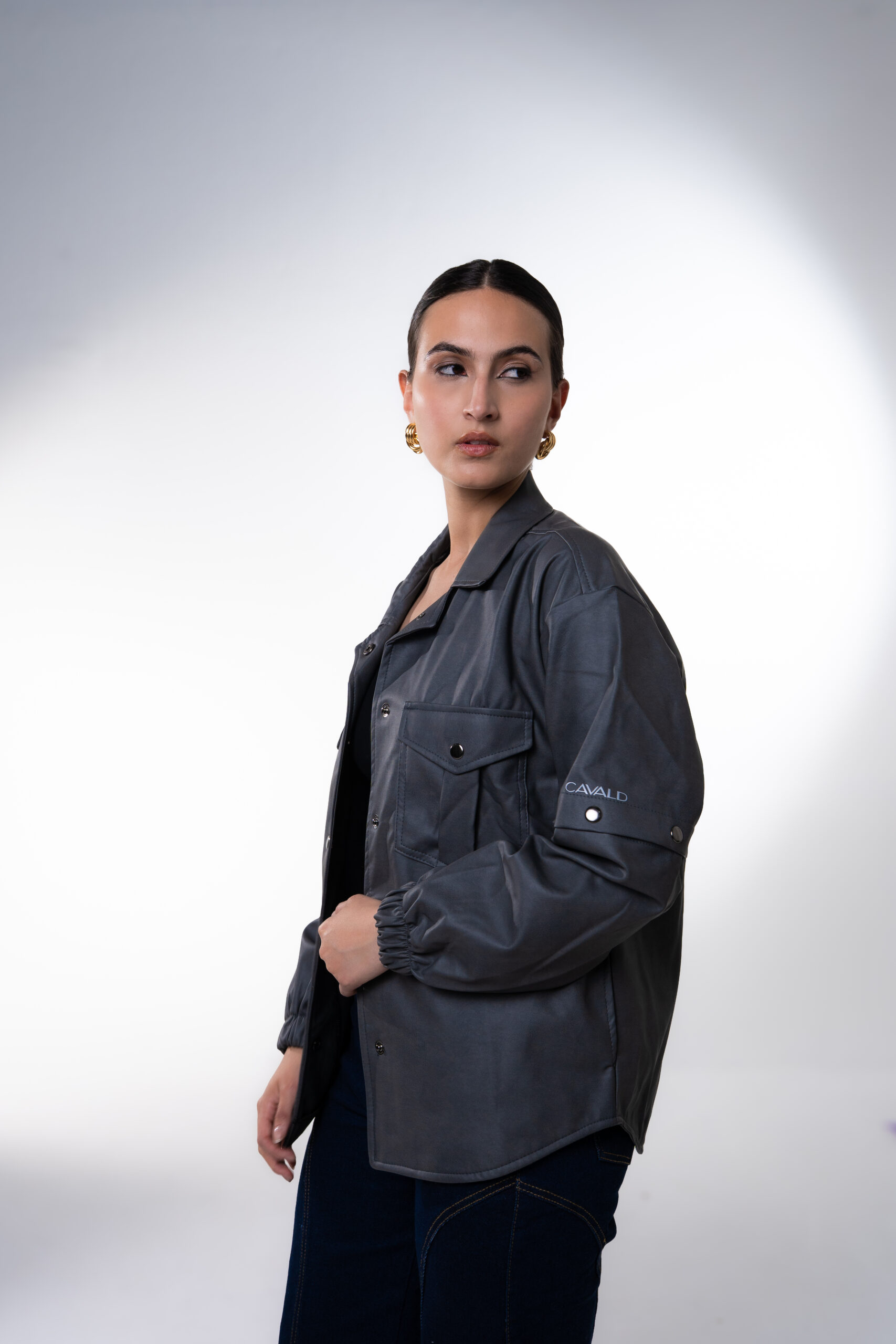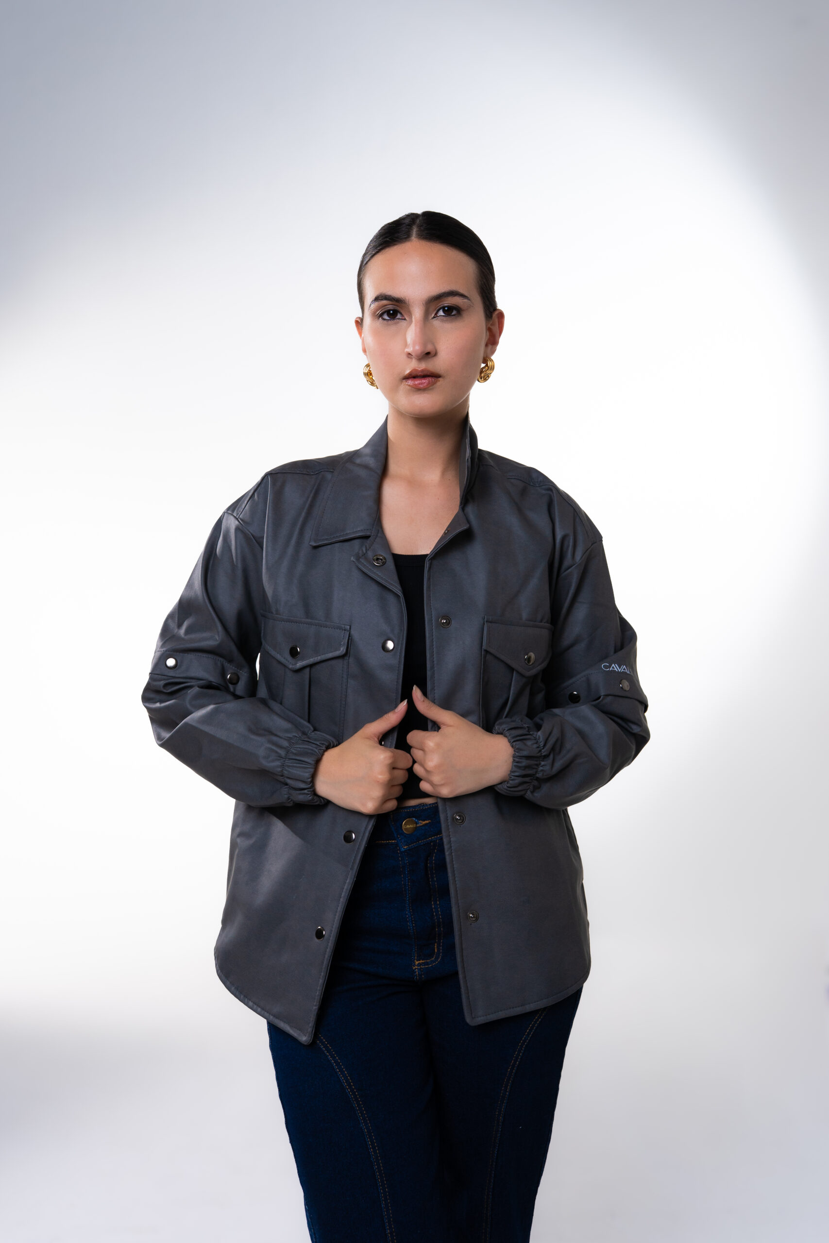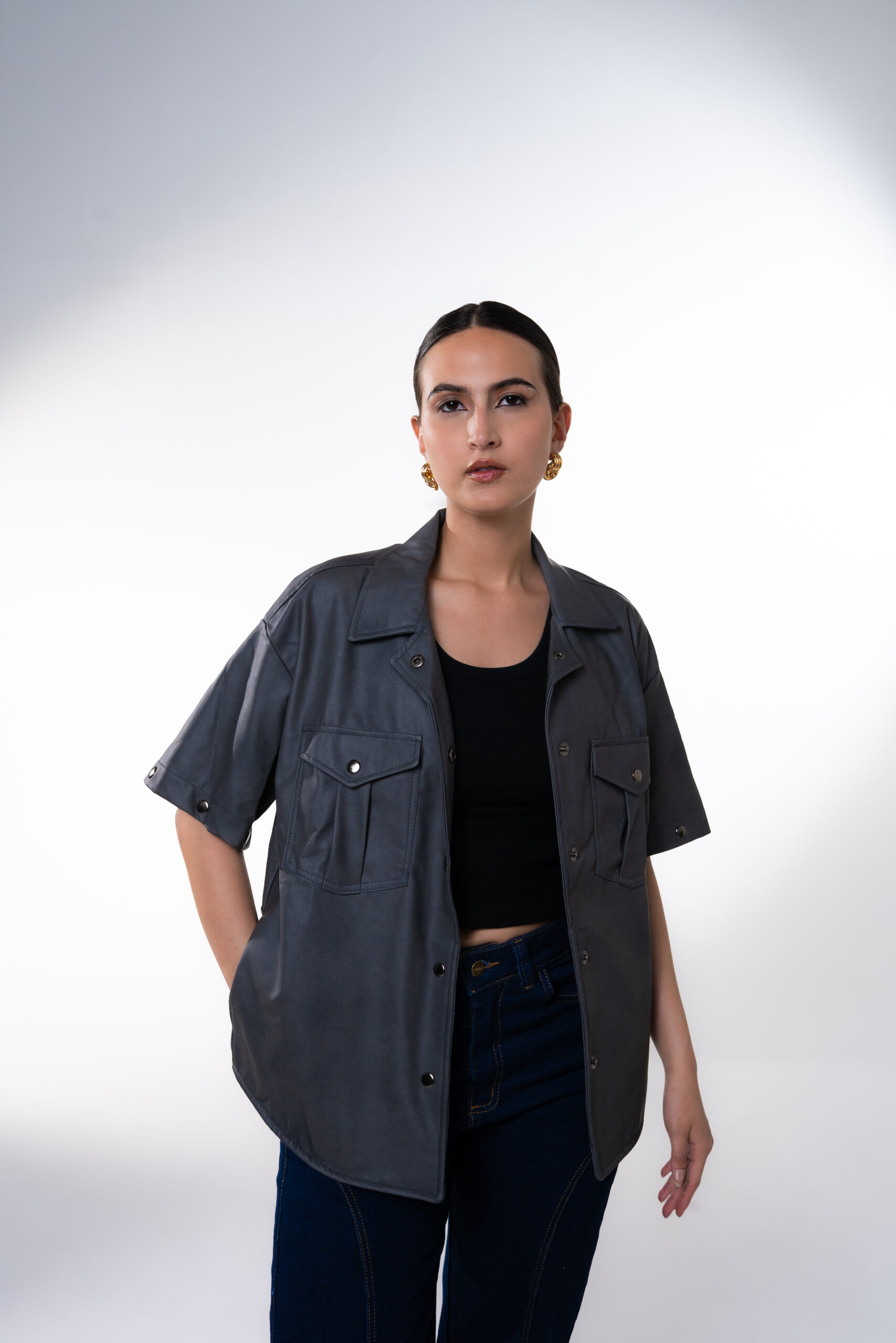 Chaqueta oversize unisex en cuerina, con mangas removibles, cuenta con seis bolsillos, dos laterales, dos internos, dos bolsillos externos con tapa y broche en acero inoxidable, cuello camisero, abotonadura en broches en acero inoxidable, resorte en la manga y estampado del logo en vinilo textil reflectivo.