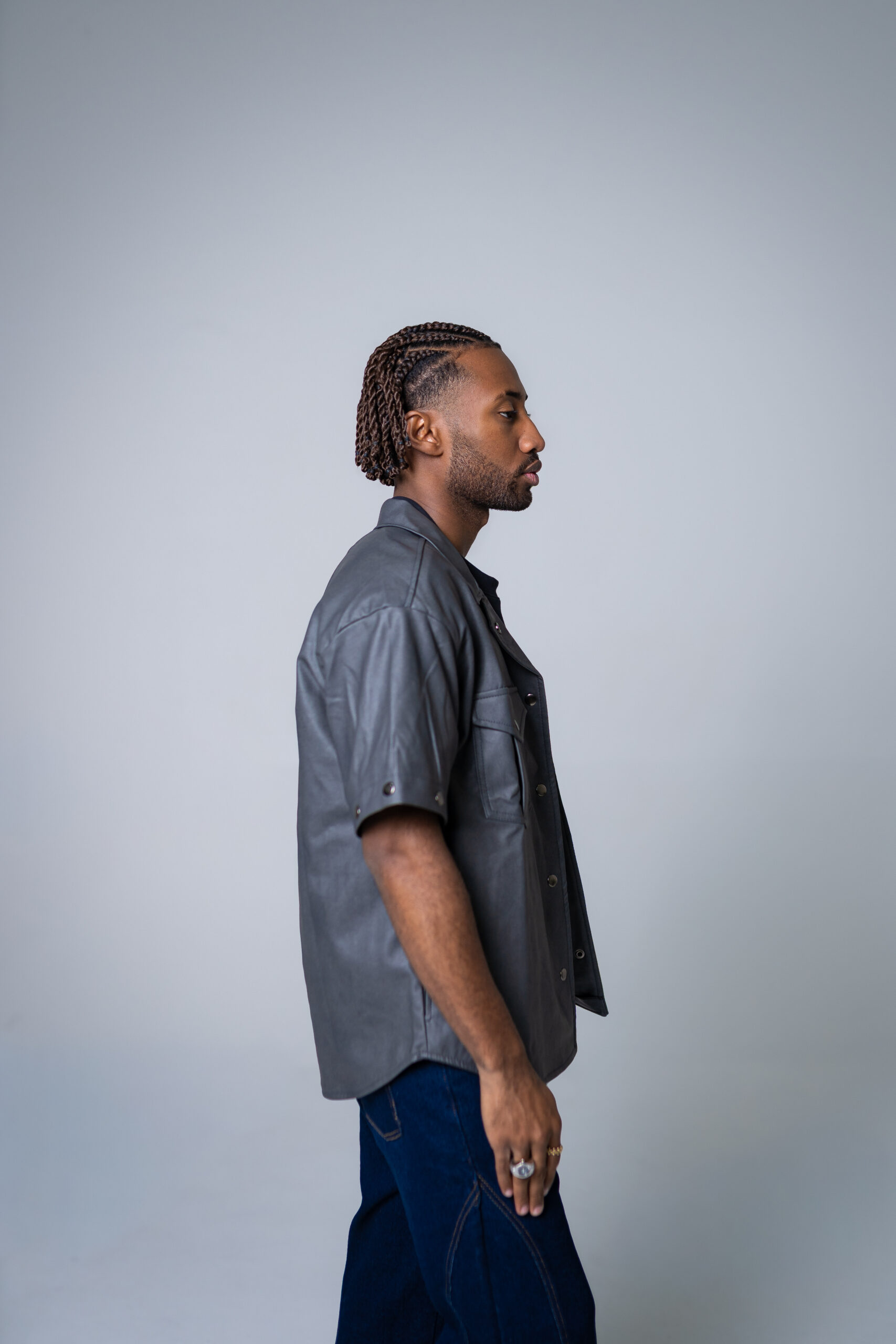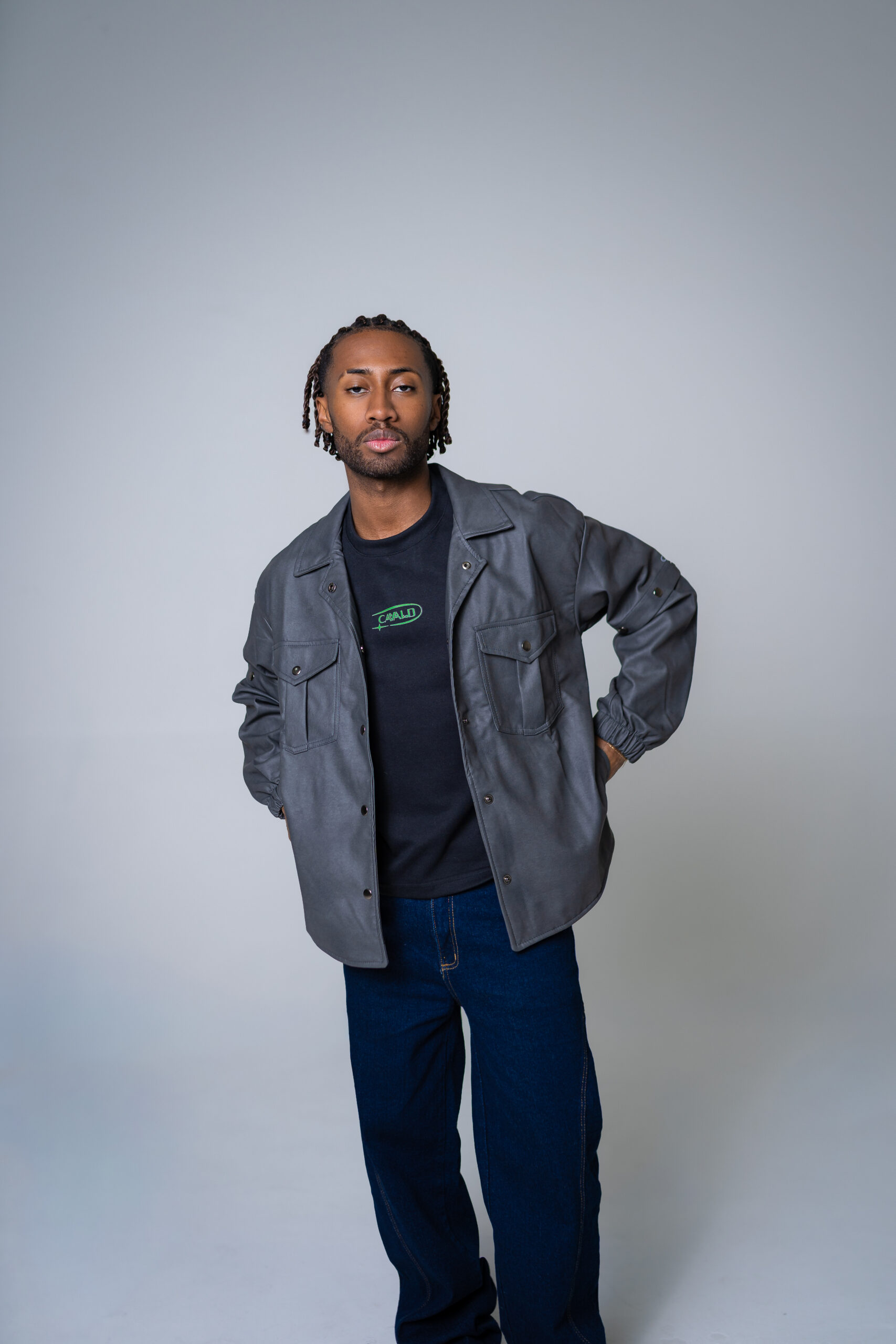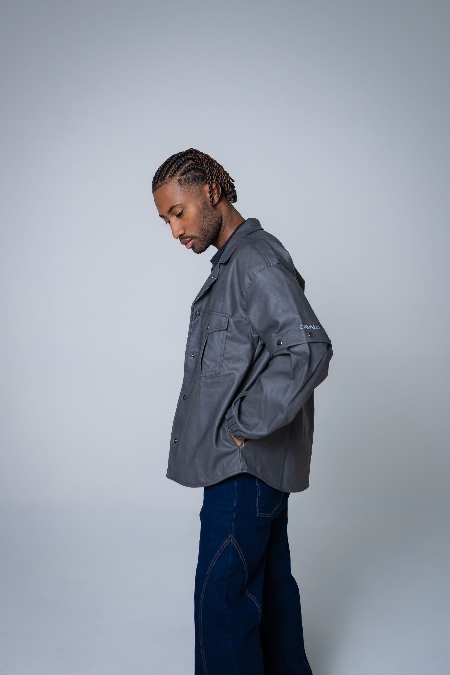 Chaqueta oversize unisex en cuerina, con mangas removibles, cuenta con seis bolsillos, dos laterales, dos internos, dos bolsillos externos con tapa y broche en acero inoxidable, cuello camisero, abotonadura en broches en acero inoxidable, resorte en la manga y estampado del logo en vinilo textil reflectivo.