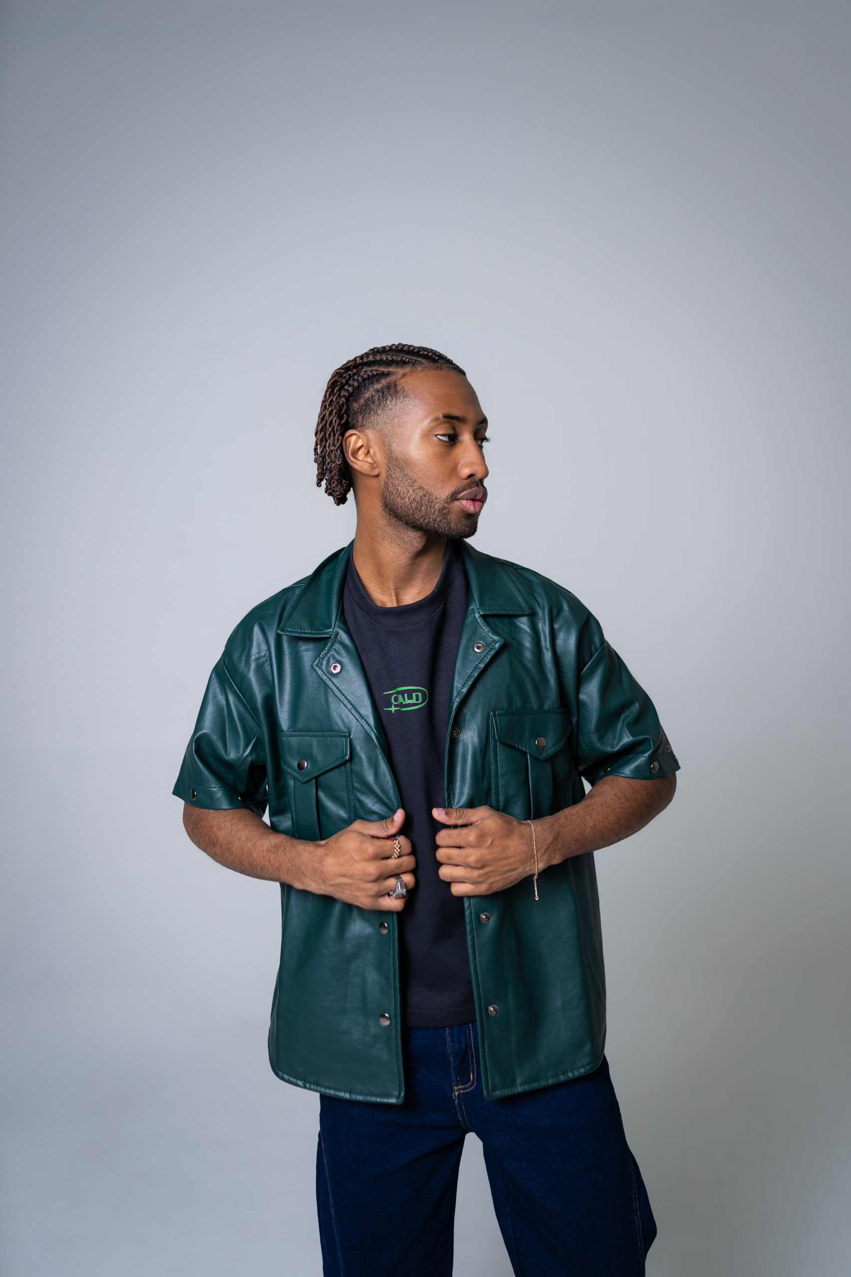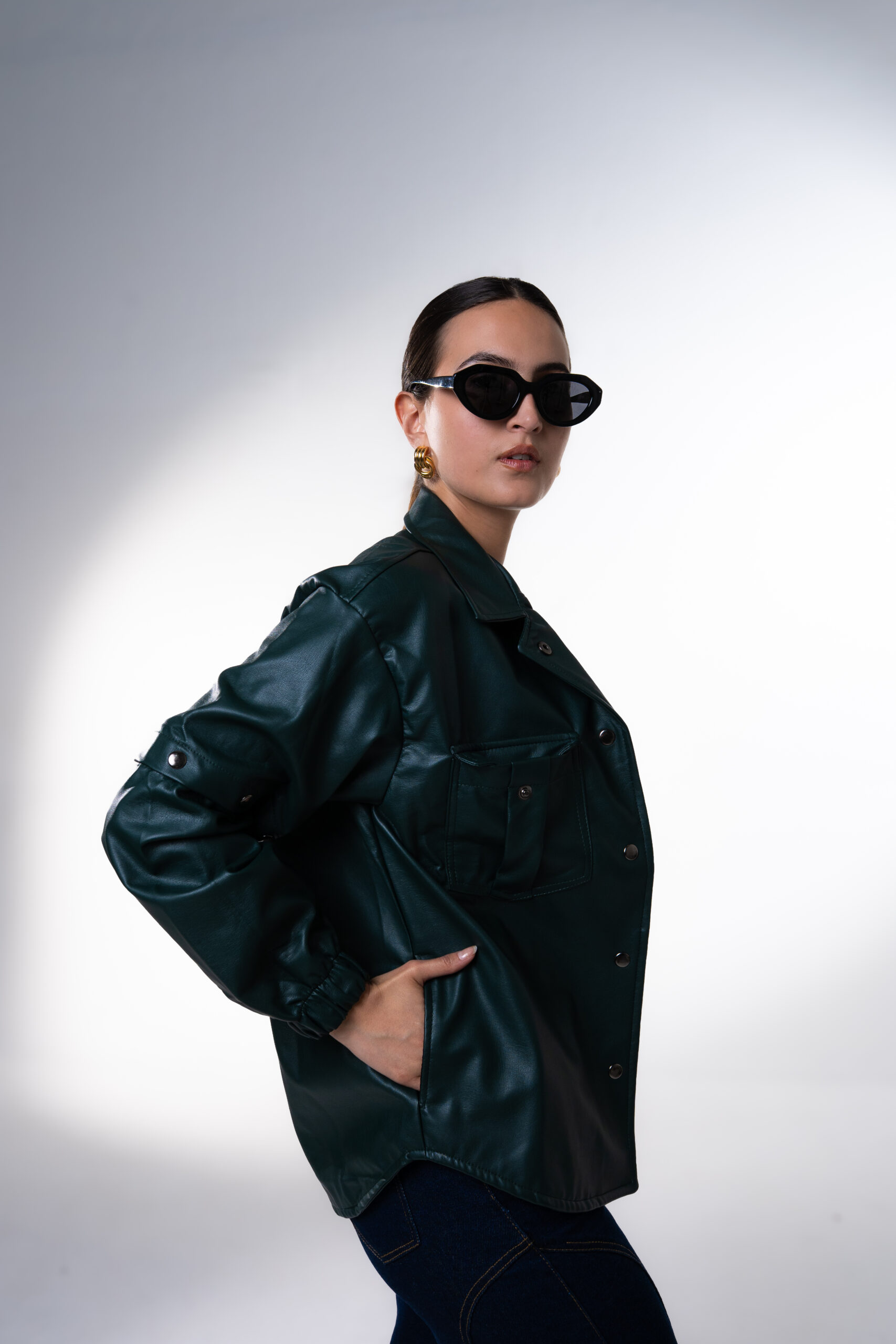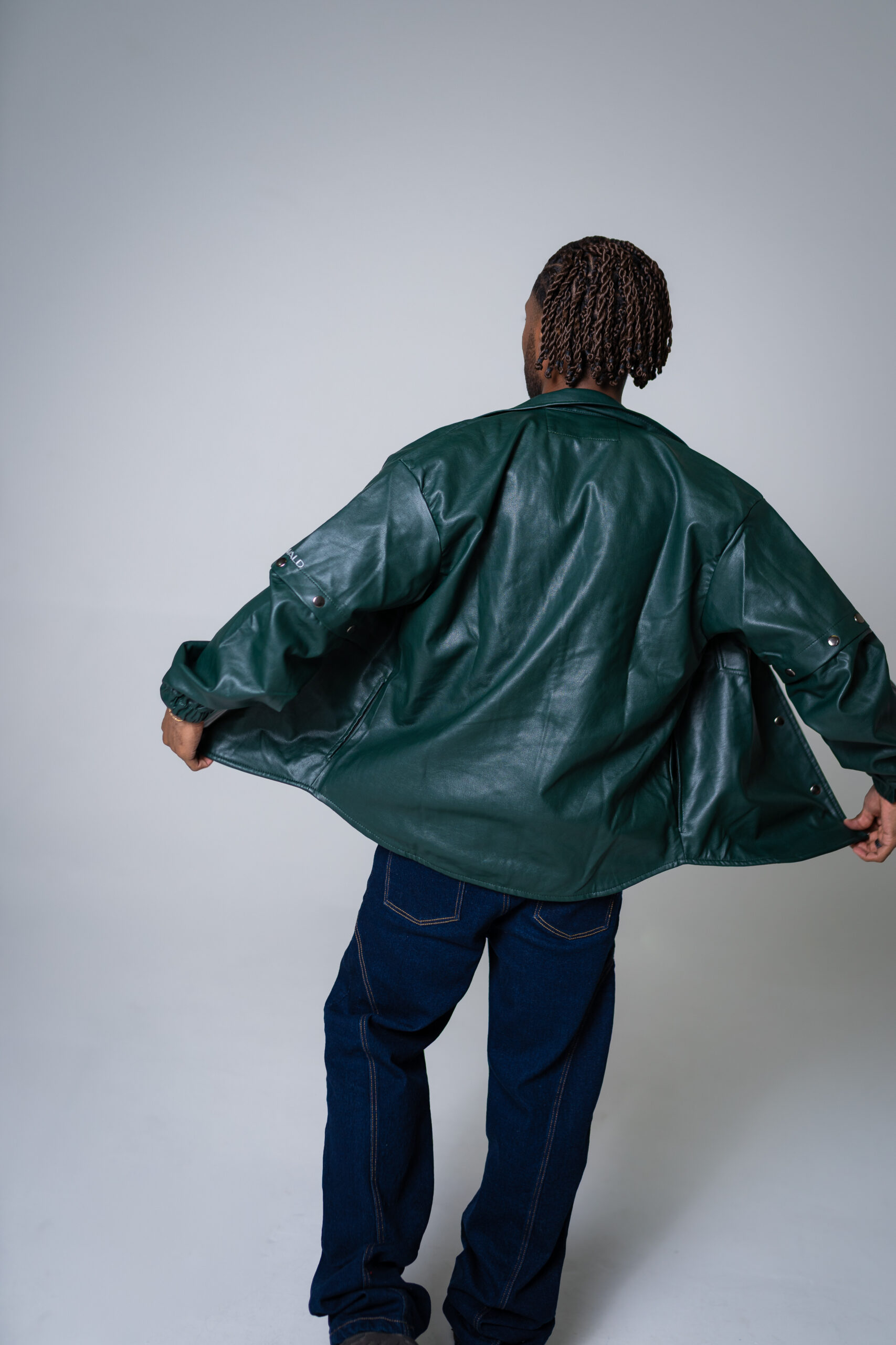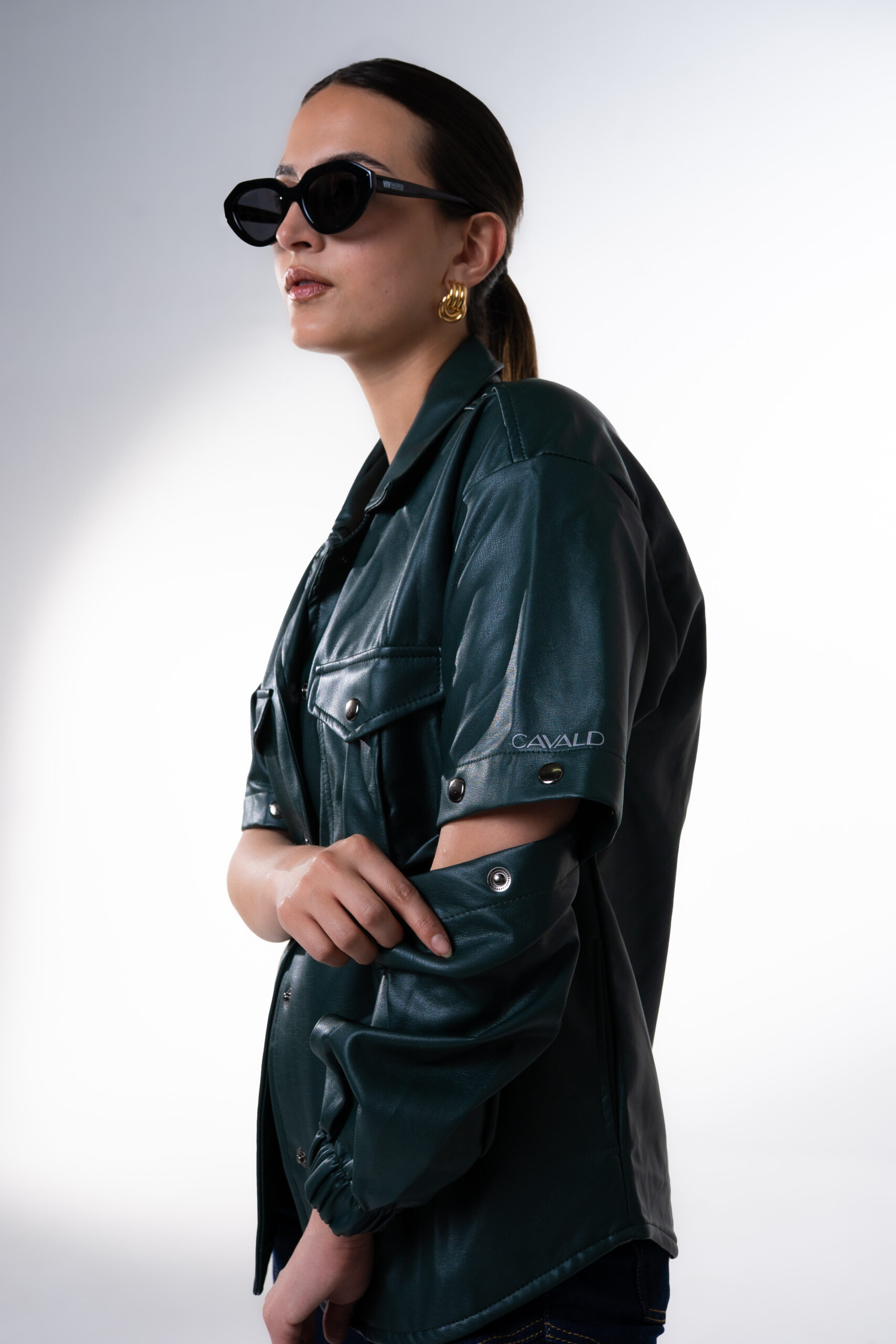 Chaqueta oversize unisex en cuerina, con mangas removibles, cuenta con seis bolsillos, dos laterales, dos internos, dos bolsillos externos con tapa y broche en acero inoxidable, cuello camisero, abotonadura en broches en acero inoxidable, resorte en la manga y estampado del logo en vinilo textil reflectivo.