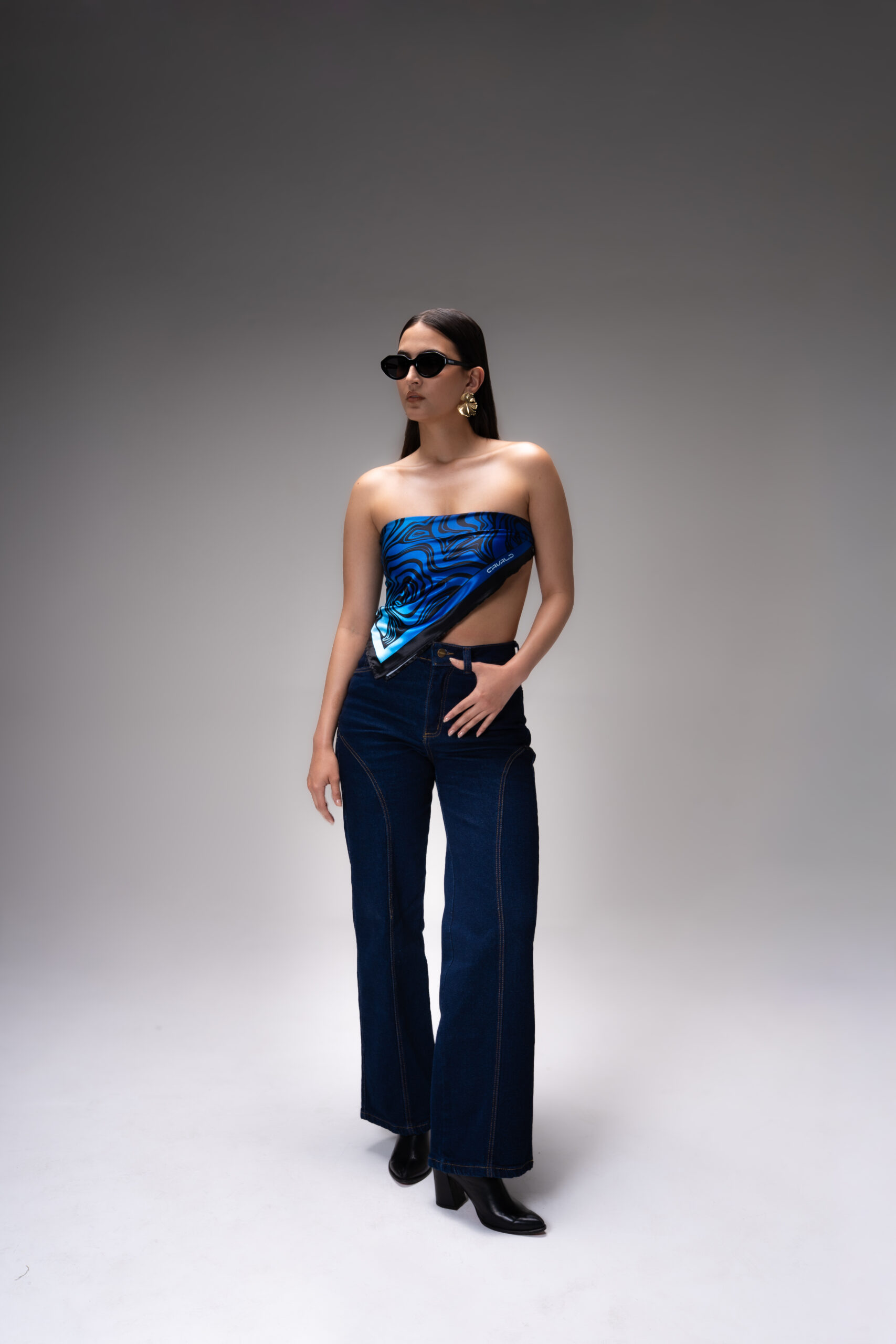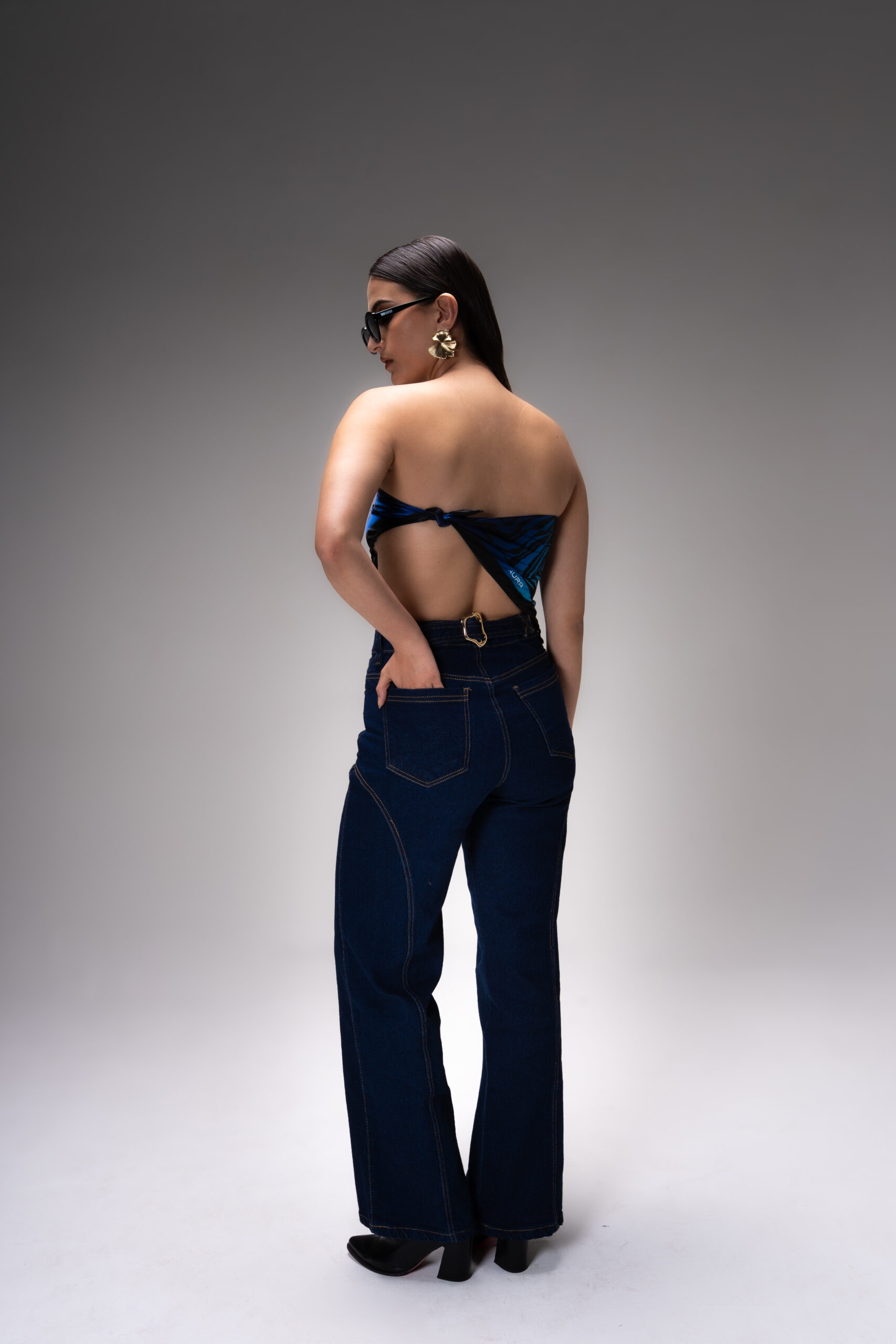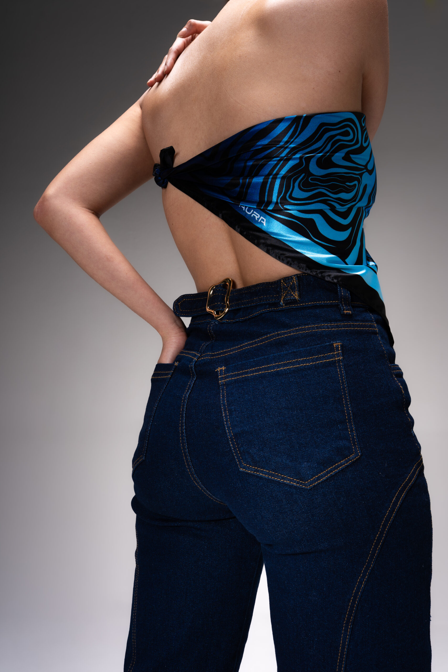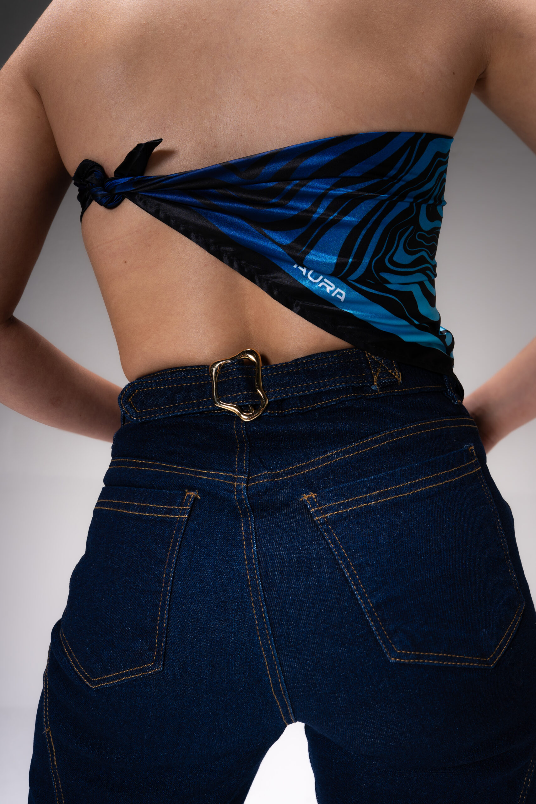 Pantalones hechos en denim azul oscuro con bolsillos frontales tradicionales, cortes curvos laterales, tira en pretina con hebilla ajustable y bolsillos posteriores. Silueta Straight y tiro alto.
